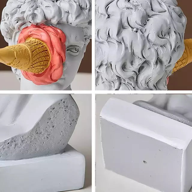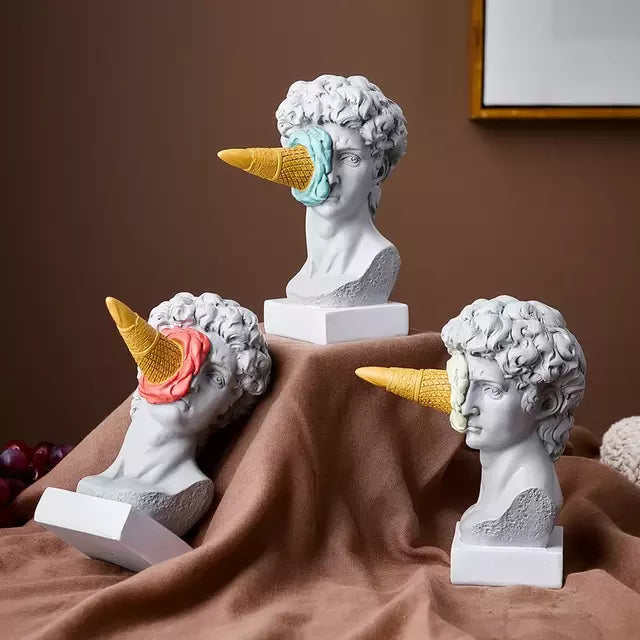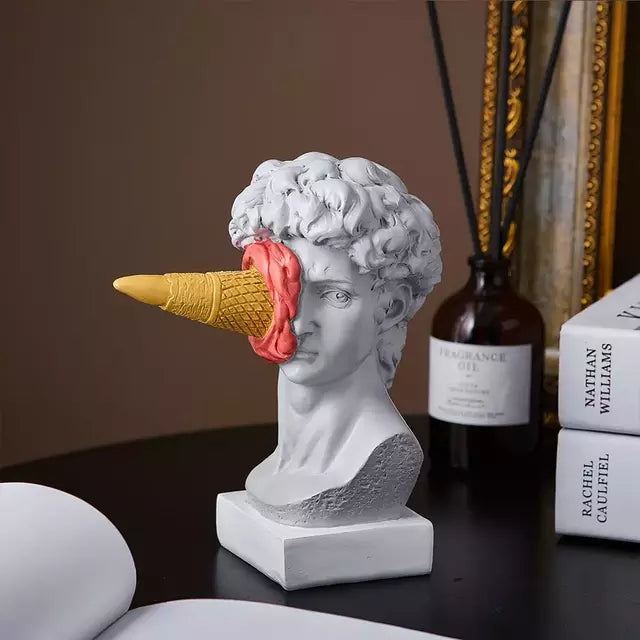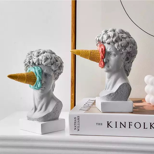 Com um design intrigante que mistura a figura icônica de David com um divertido sorvete, esta escultura é perfeita para qualquer espaço que precise de um toque de criatividade e sofisticação.