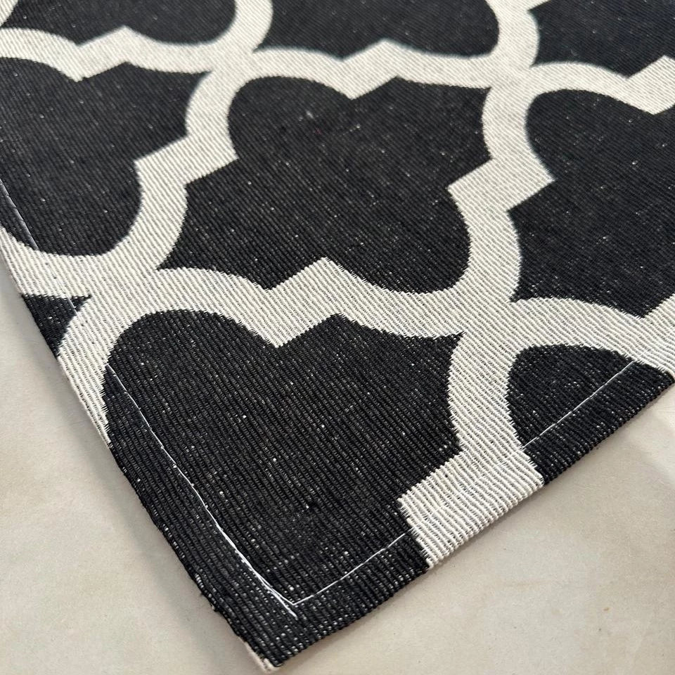 O Tapete Mosaico Geométrico Jacquard vem com bainha em todos os lados, evitando que as pontas se enrolem e garantindo maior durabilidade. O material de alta qualidade assegura que seu tapete permaneça com uma aparência impecável por mais tempo.